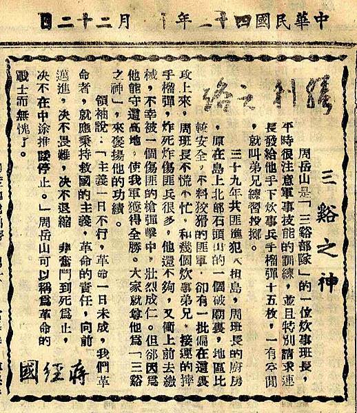 周岳山是一個三谿之隊資谿大隊駿部一小隊的炊事班長.在大膽戰役中領導全體炊事班與共軍對抗.最後壯烈犧牲! 胡司令官特別贈予他一個三谿之神的稱號!
